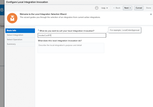 Now let's create Integration1 with the name CreateCsvFileFromDB to read data from the On-Premise Database instance
